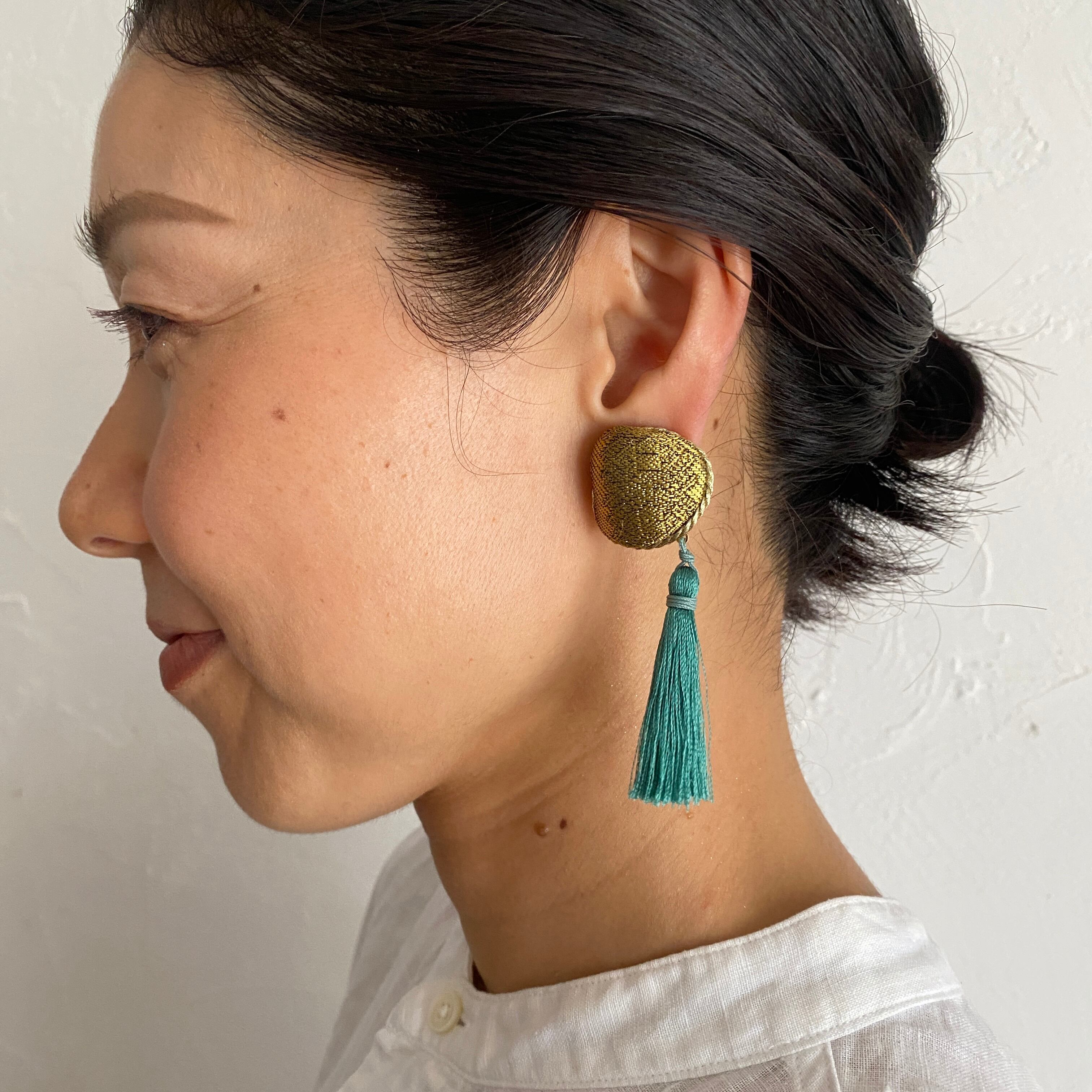These asymmetrical earrings are made with shijimi clam shells from Lake Shinji, carefully wrapped in traditional Hakata-ori fabric known for its elegant silk sheen.