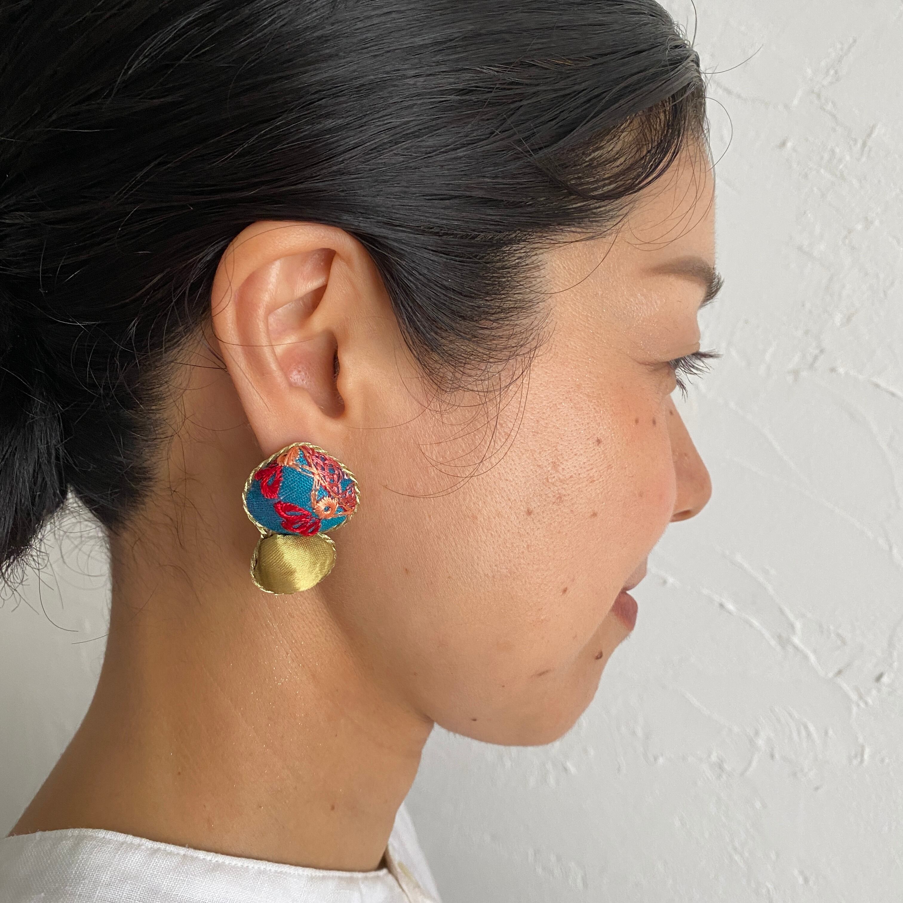 "宍道湖産しじみの貝殻を、華やかな刺繍が特徴的なインドリボンや布で包んだピアス。