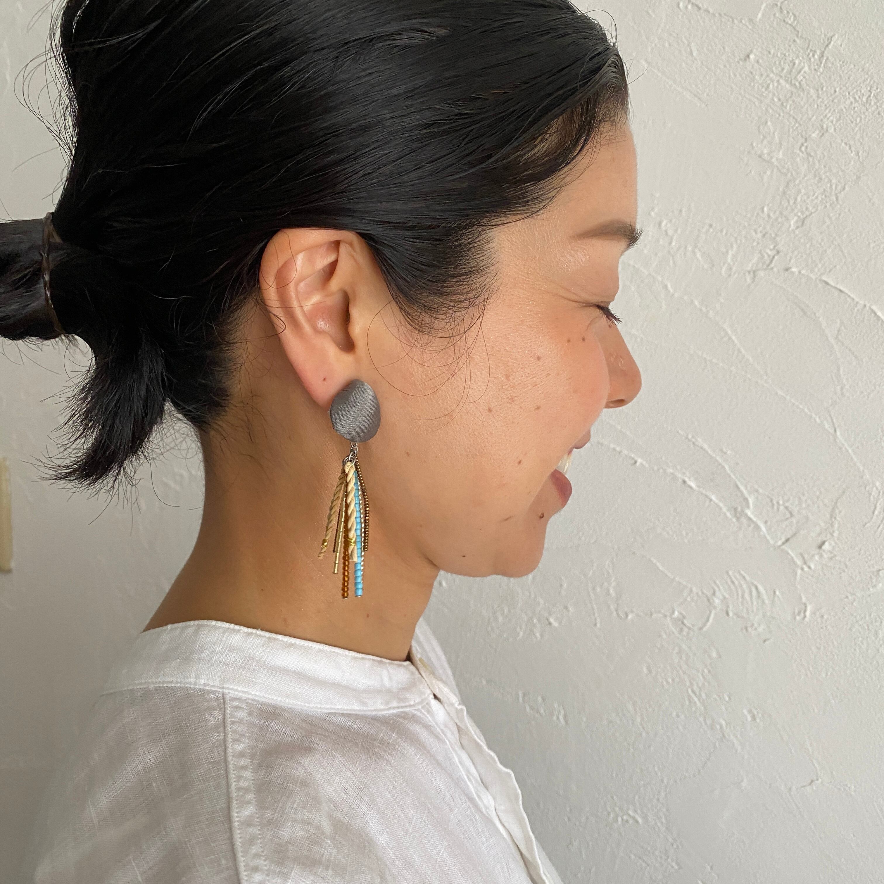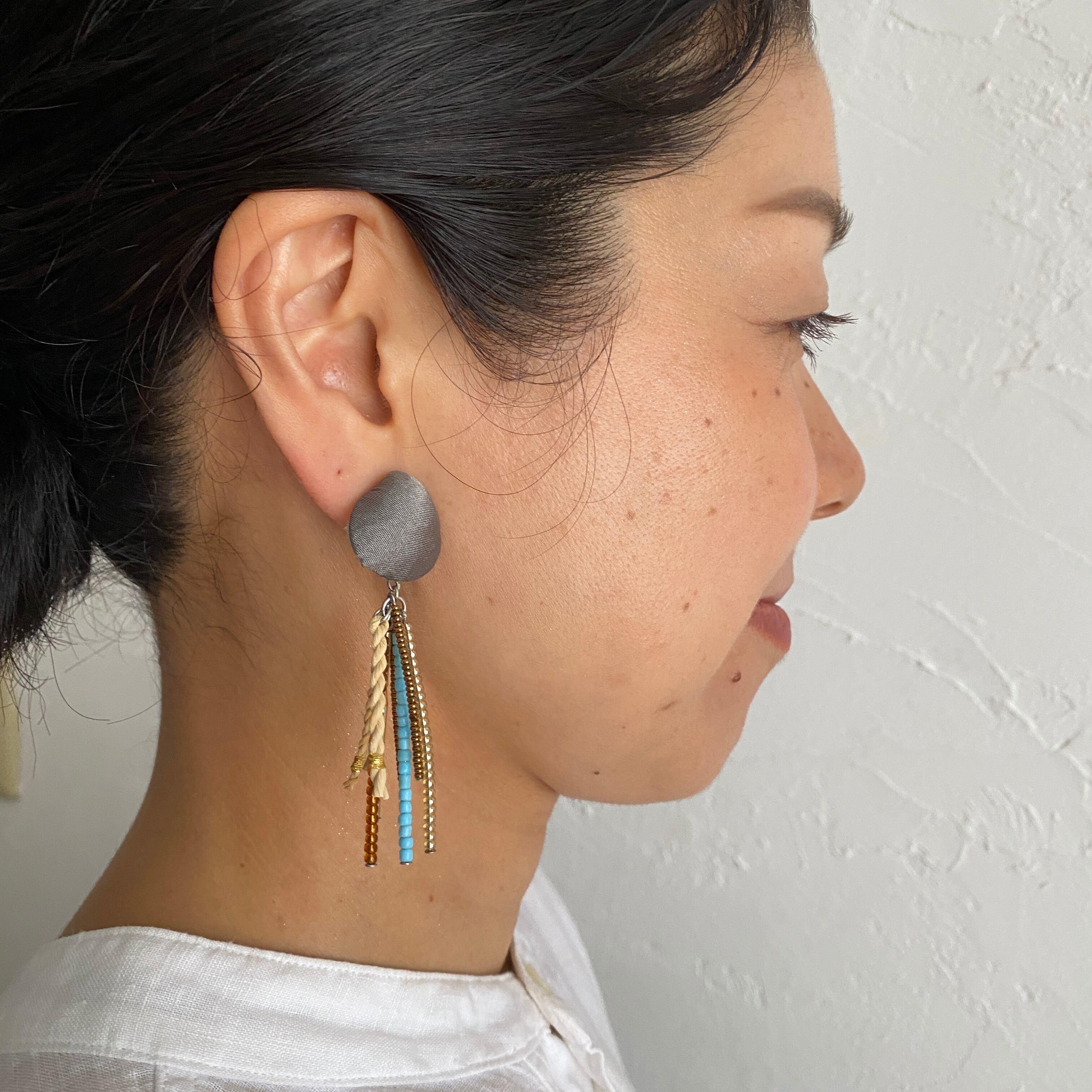 "宍道湖産しじみの貝殻を布で包み、真菰とチェコビーズ、ガラスビーズを組み合わせたマルチカラーのタッセルをあしらったイヤリング。