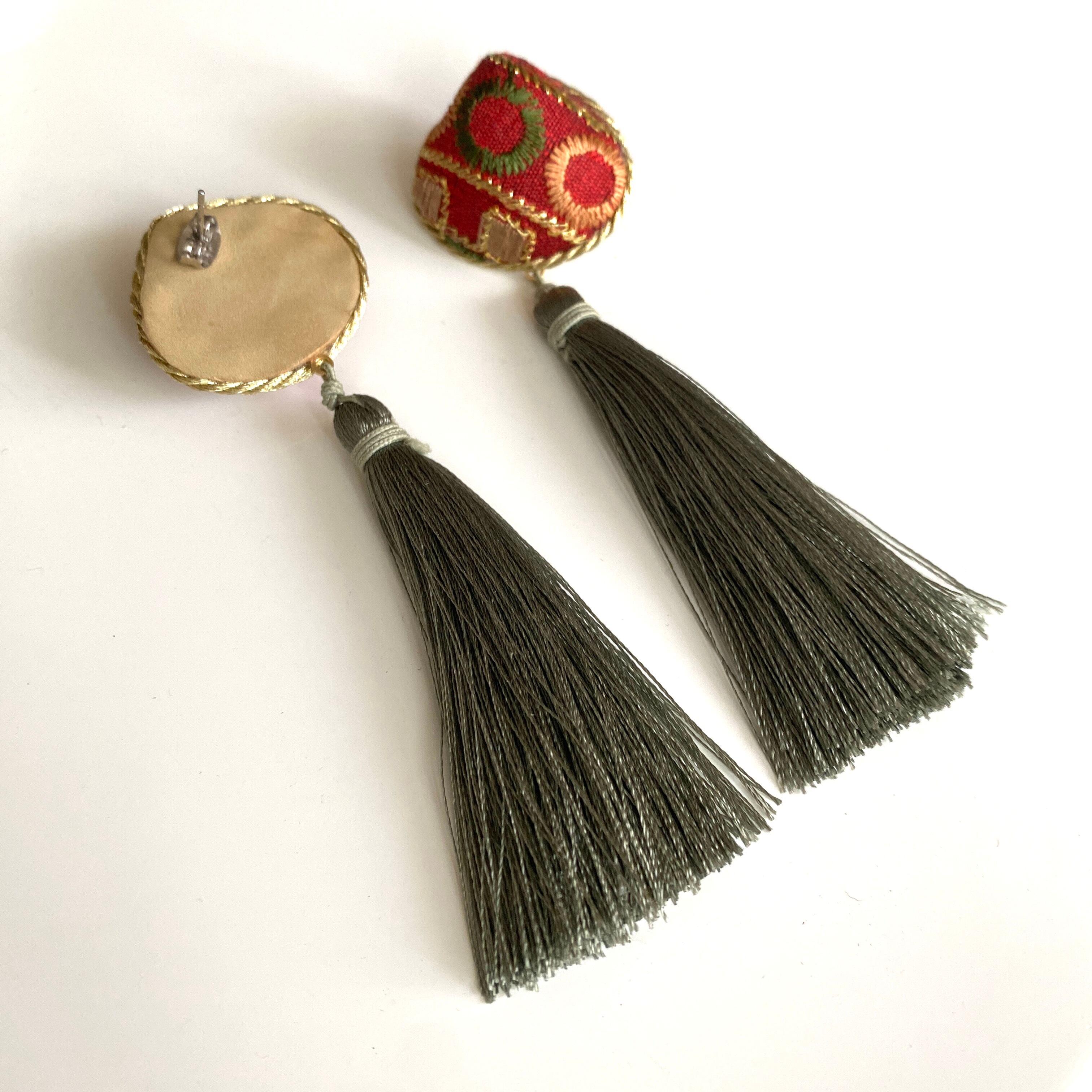 Elegant tassel pierced earrings featuring large Lake Shinji clam shells, wrapped in Indian ribbon with gorgeous embroidery.