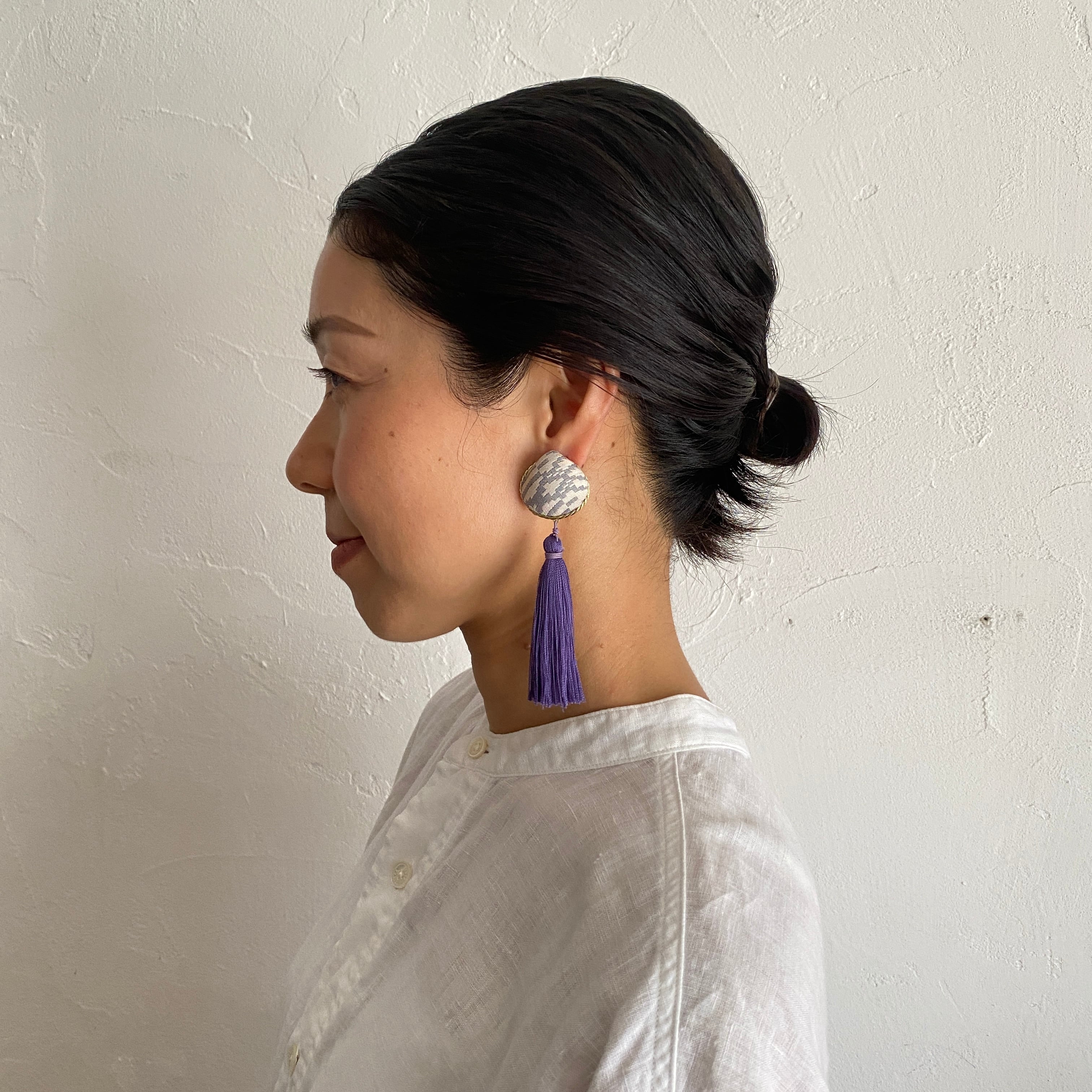 "大粒の宍道湖産しじみの貝殻を、絹独特の光沢のある博多織の生地で包んだタッセルイヤリング。
