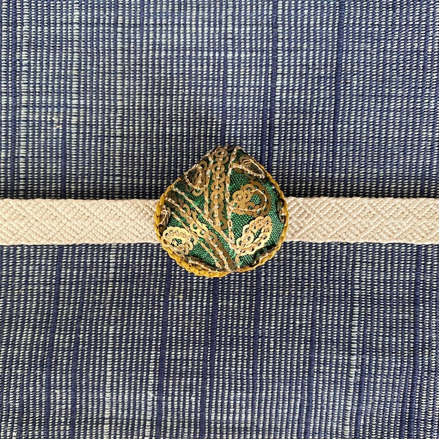Materials: Shijimi clam shell, ribbon, thread, cowhide leather, cord, rayon thread, brass fittings, surgical stainless steel 316, silicone"