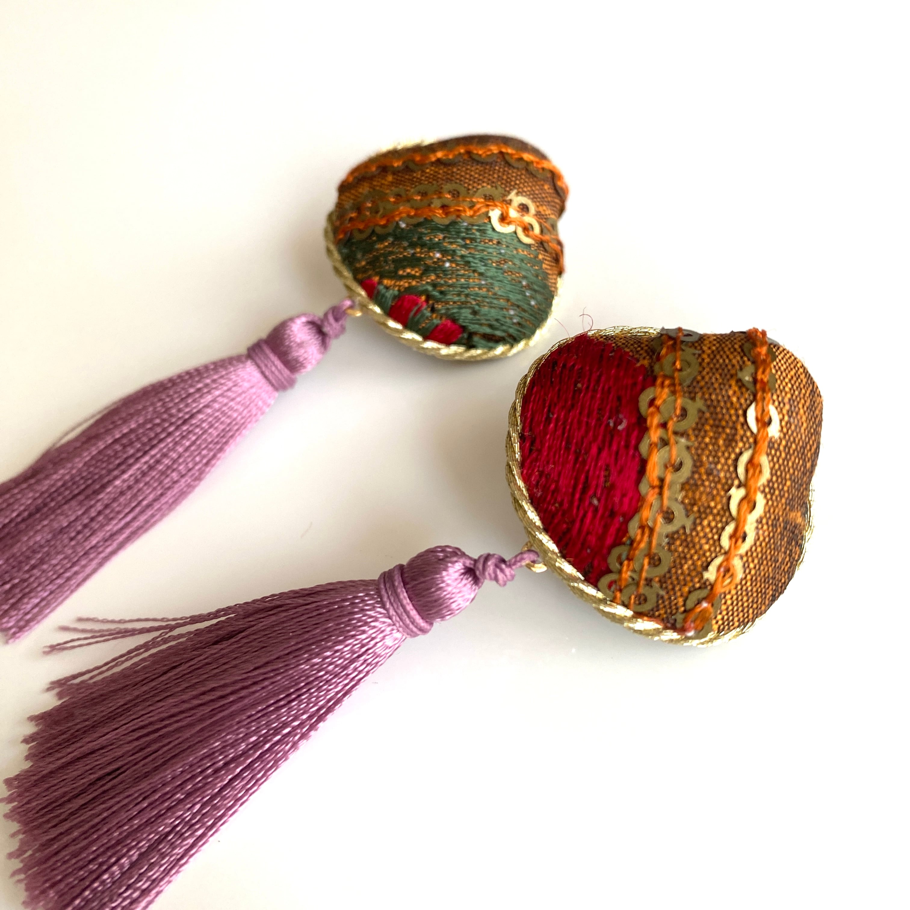 Tassel earrings made of clam shells from Lake Shinji wrapped in Indian ribbon with gorgeous embroidery.