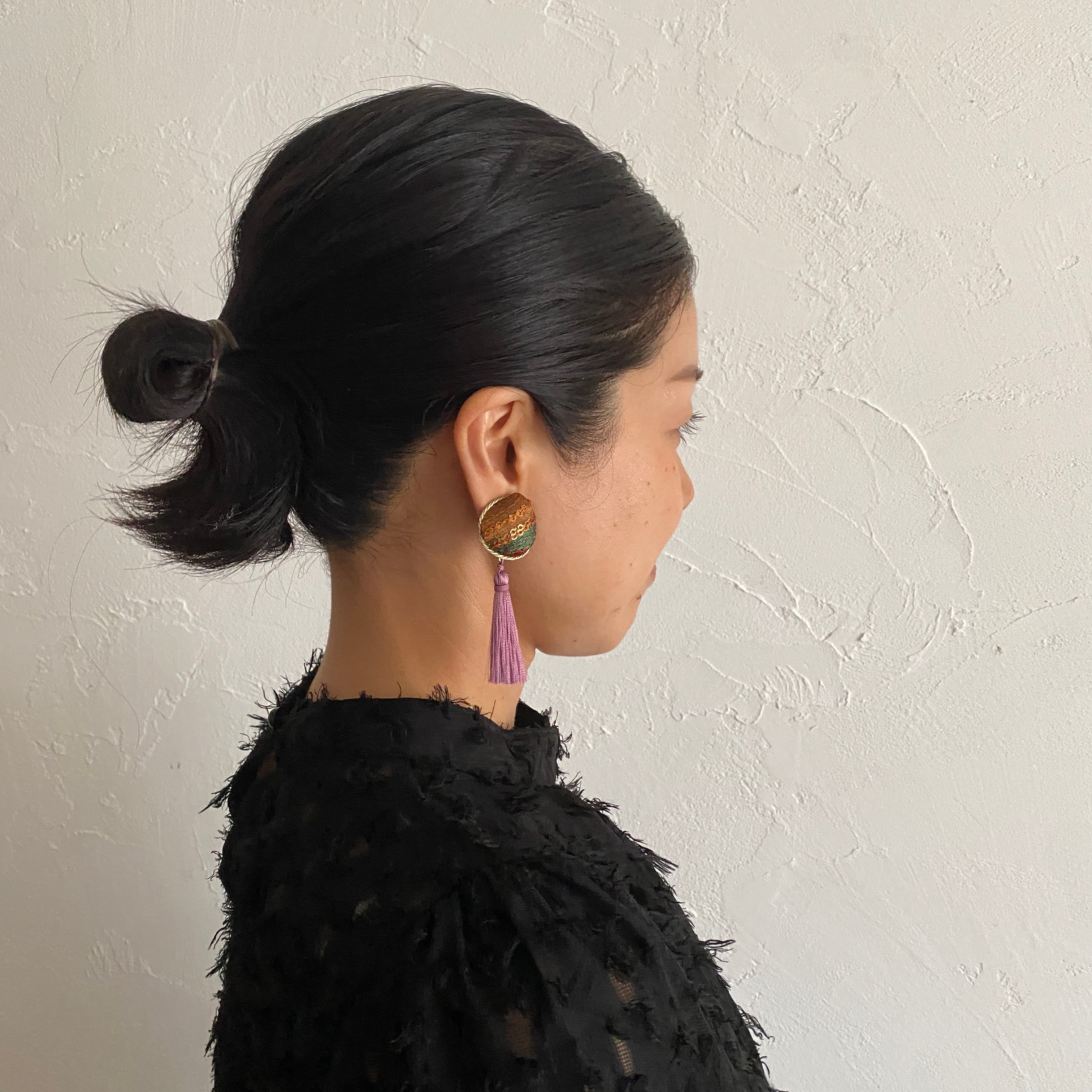 "宍道湖産しじみの貝殻を、華やかな刺繍が特徴的なインドリボンで包んだタッセルイヤリング。