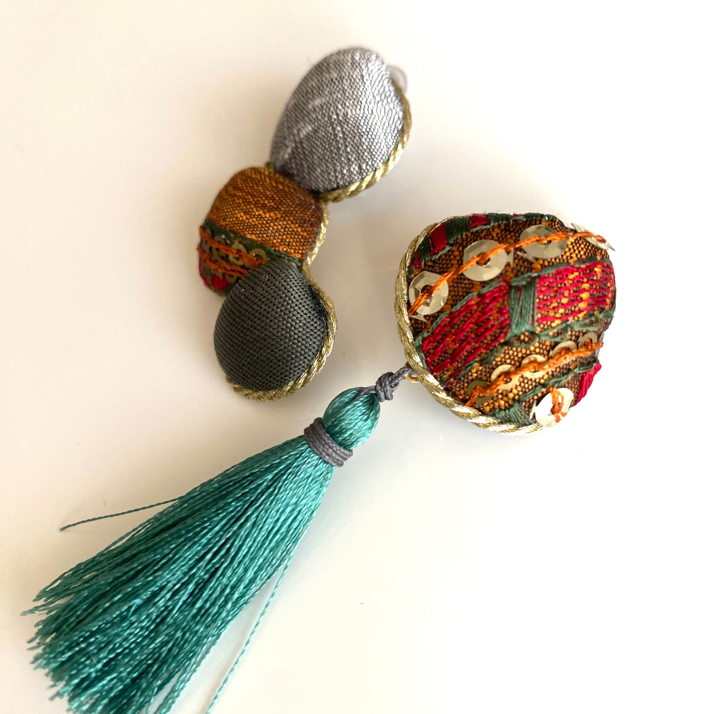 "宍道湖産しじみの貝殻を、華やかな刺繍が特徴的なインドリボンや布で包んだイヤリング。