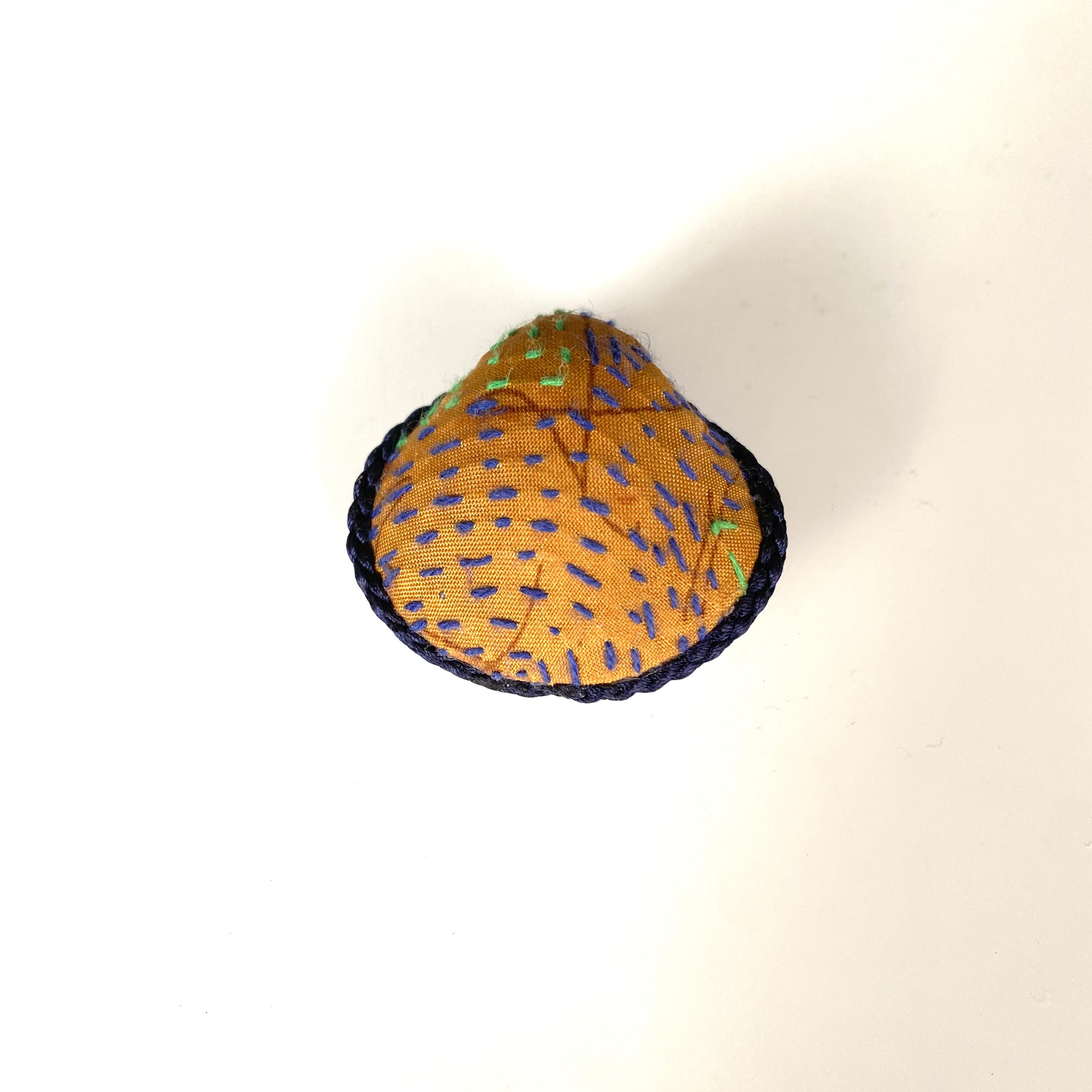 A rare, extra-large sized shijimi clam shell from Lake Shinji wrapped in Indian Kantha, which has the warmth of handmade craftsmanship.