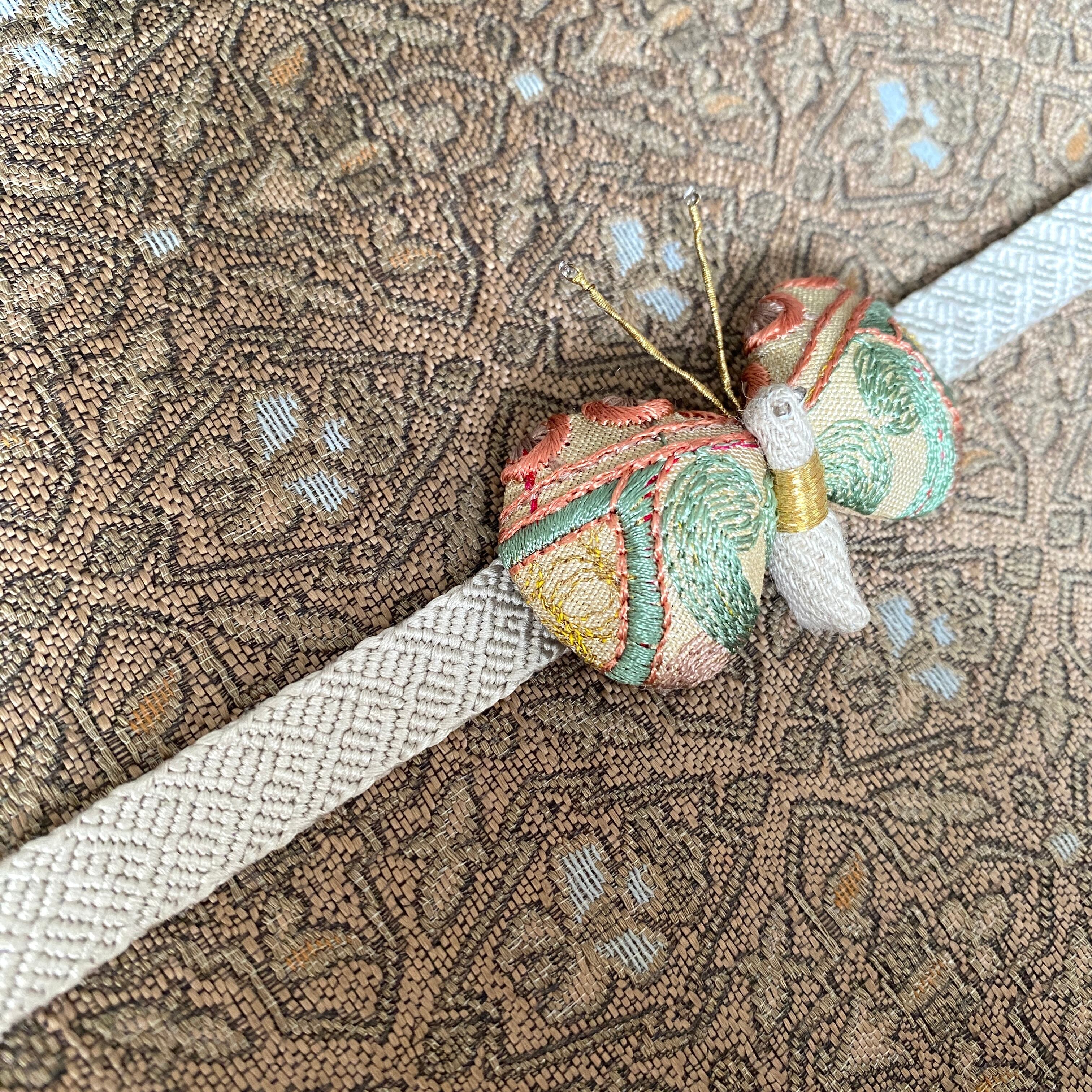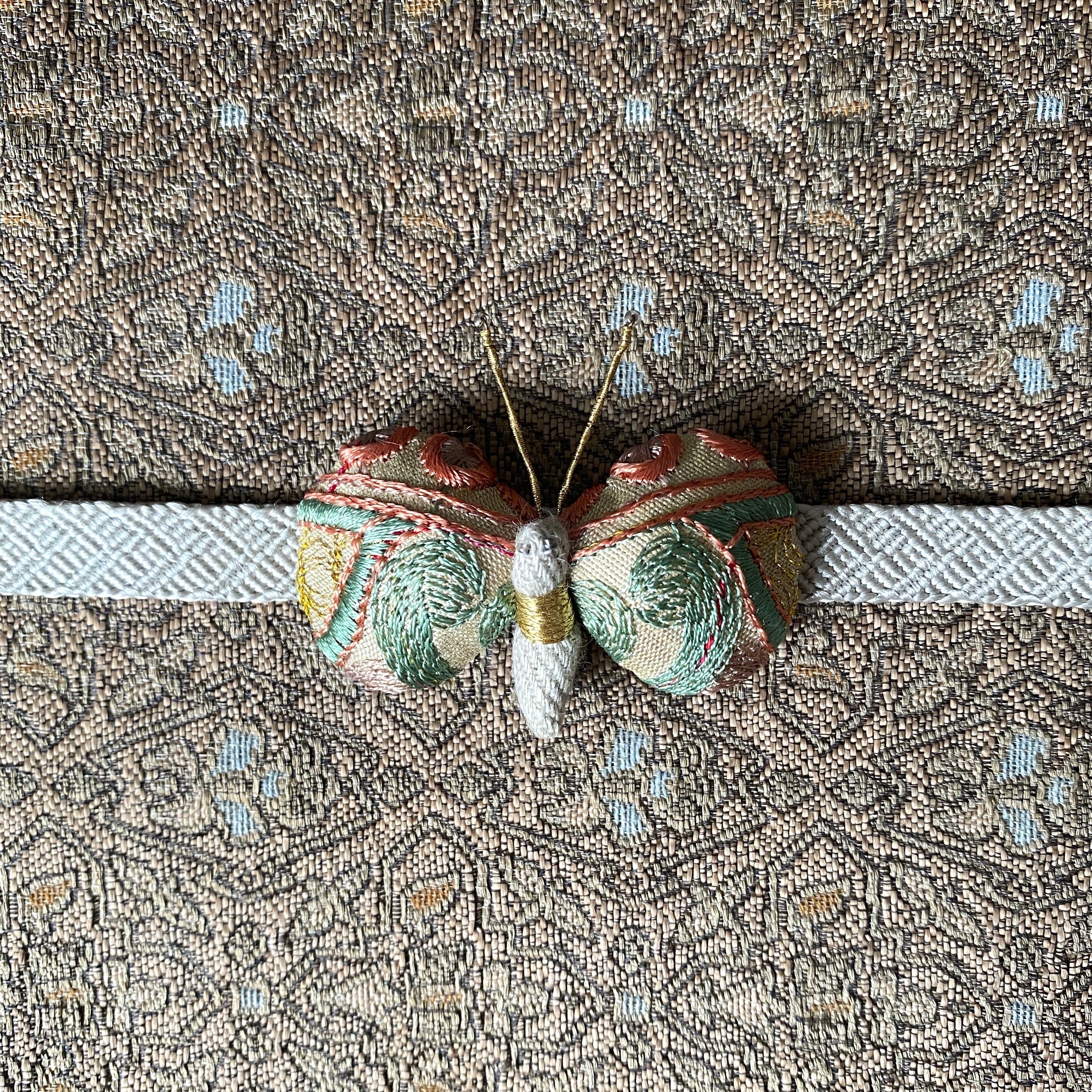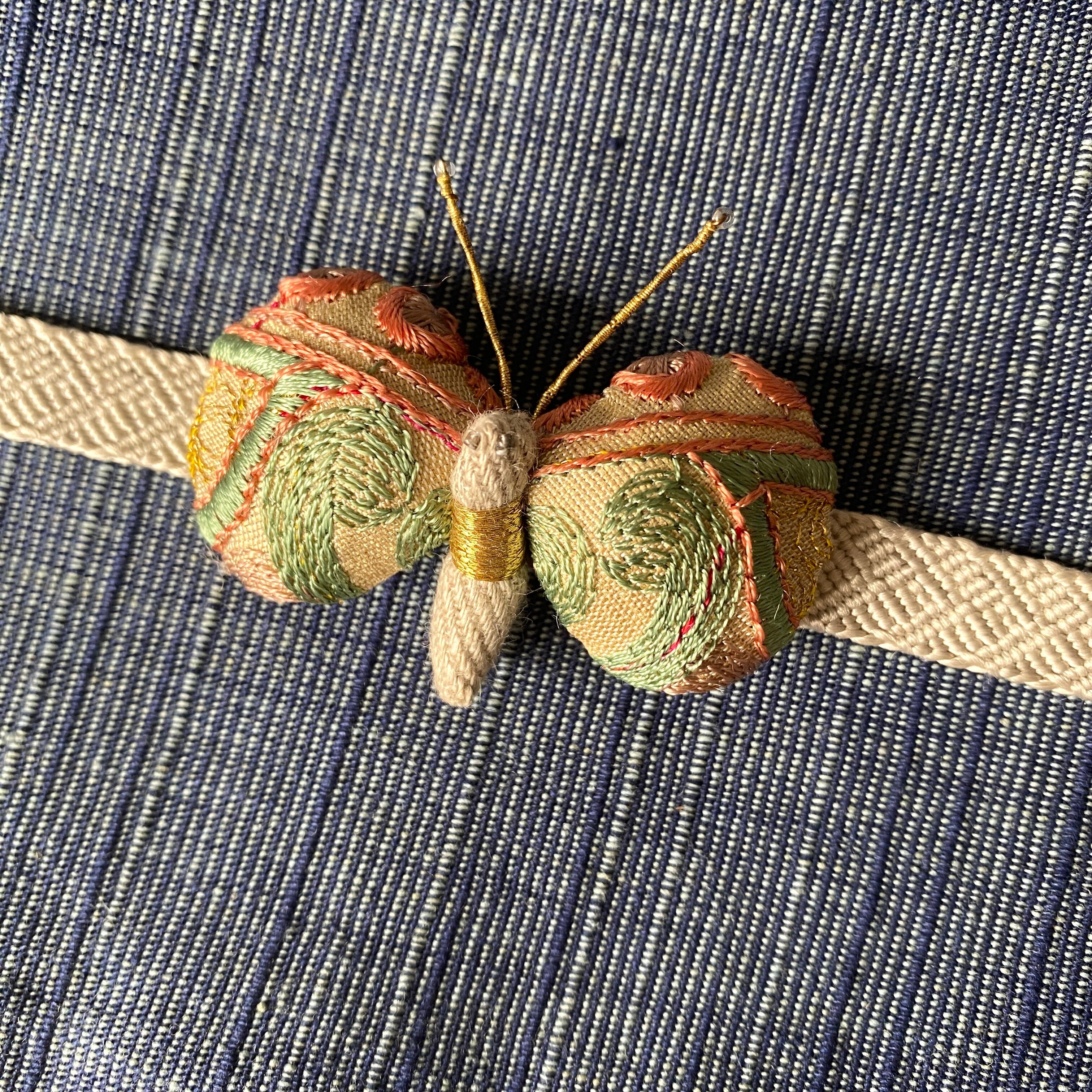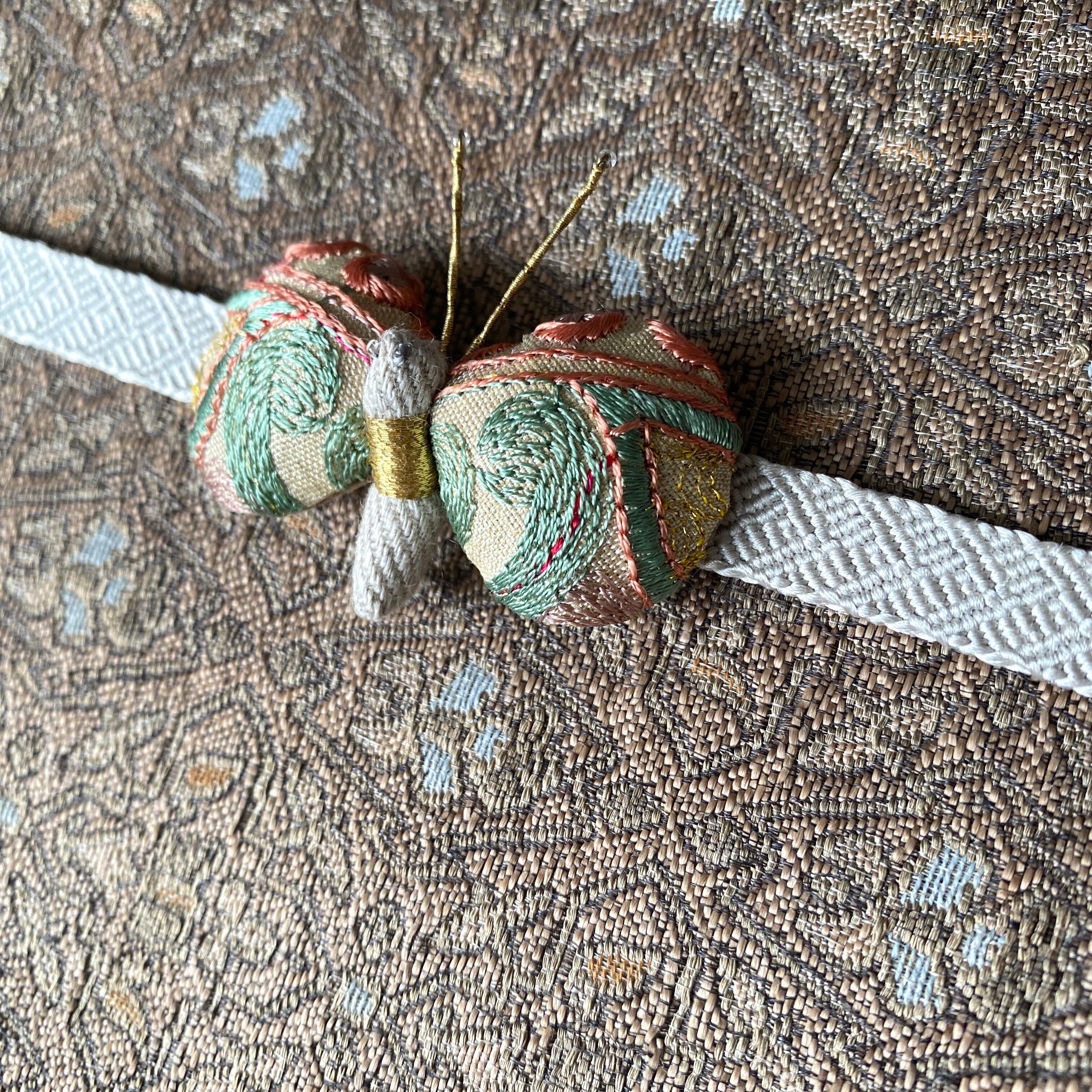 "大粒の宍道湖産しじみの貝殻を、華やかな刺繍が特徴的なインド刺繍リボンで包んだ、ちょうちょの帯留。