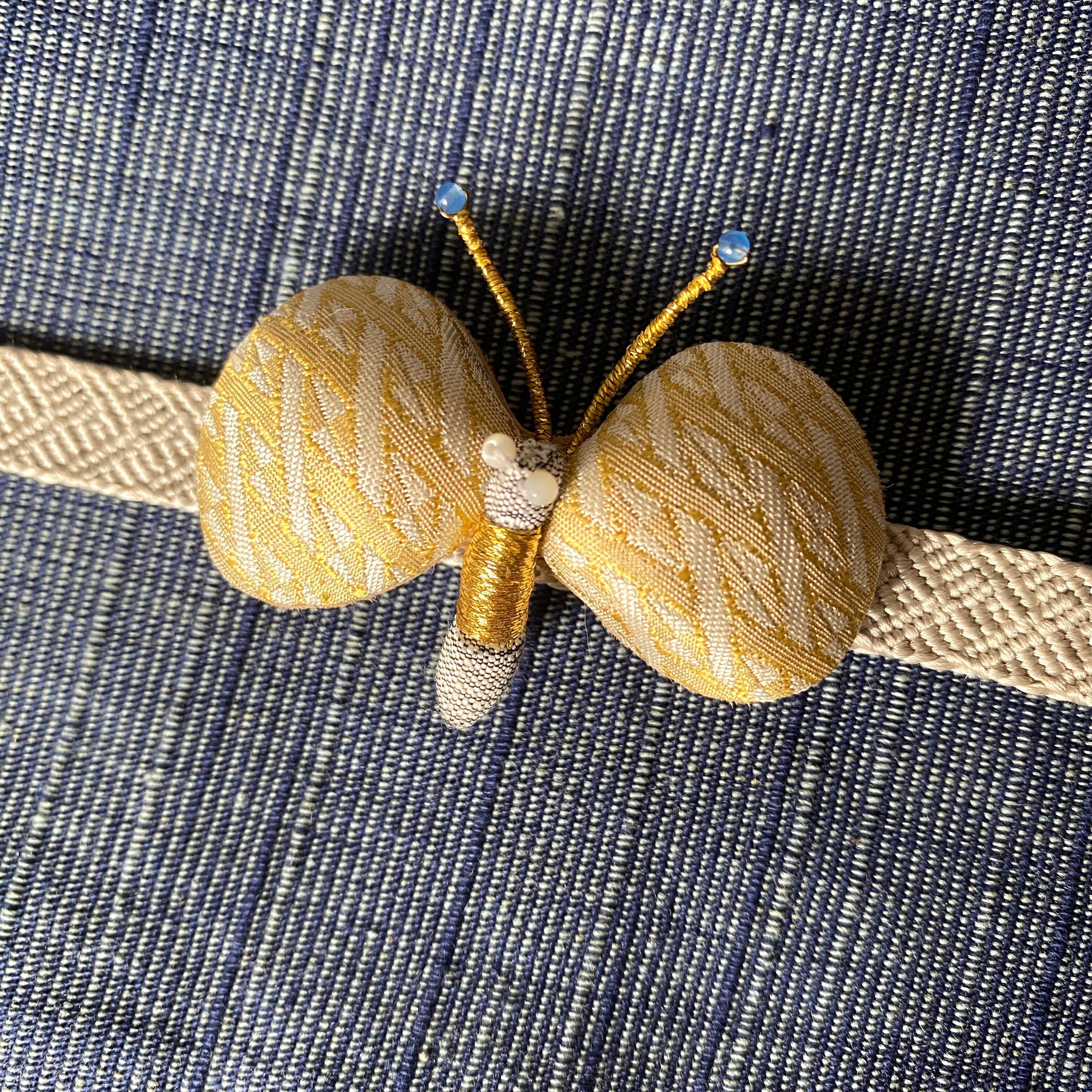 "大粒の宍道湖産しじみの貝殻を、絹独特の光沢のある博多織の生地で包んだ、ちょうちょの帯留。