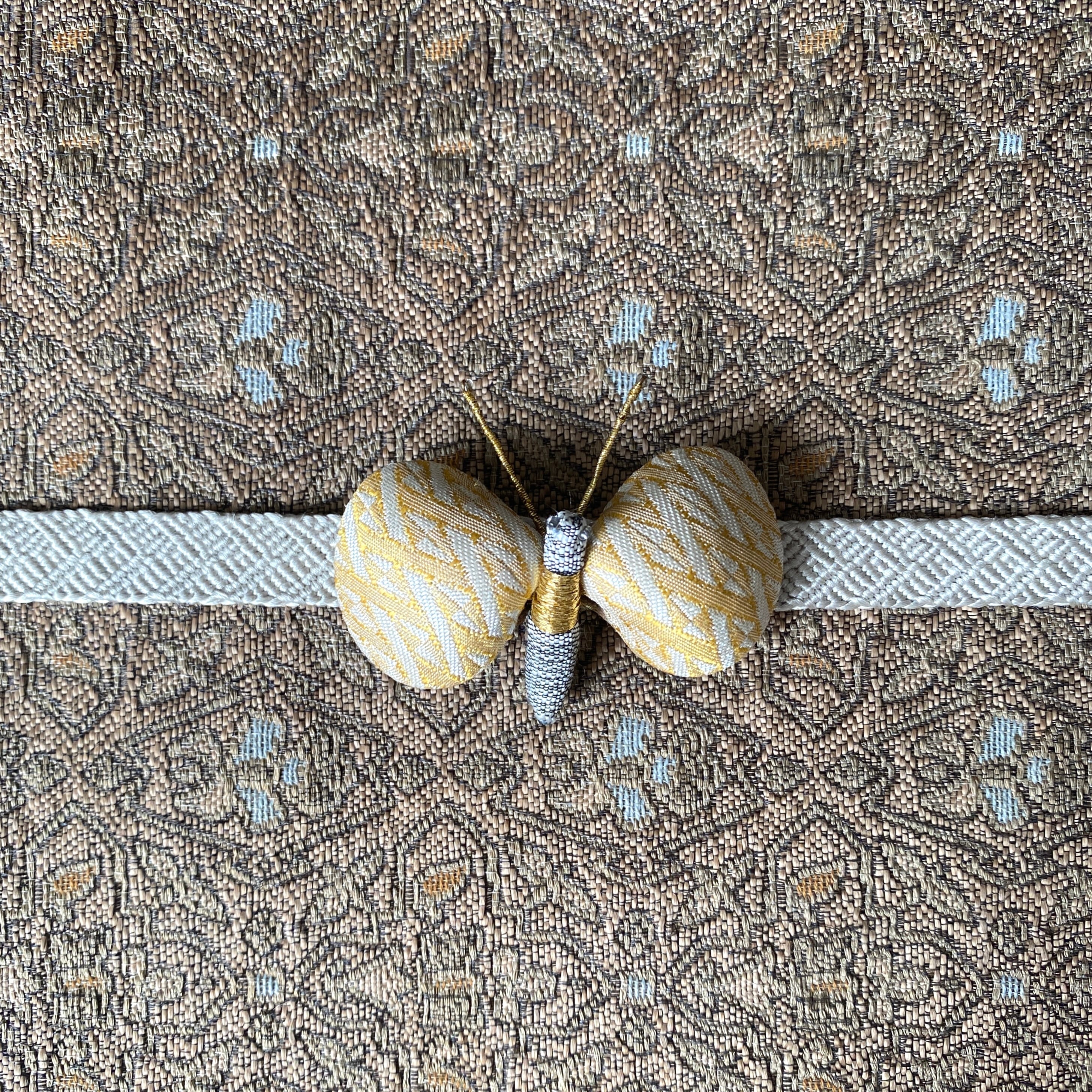"大粒の宍道湖産しじみの貝殻を、絹独特の光沢のある博多織の生地で包んだ、ちょうちょの帯留。