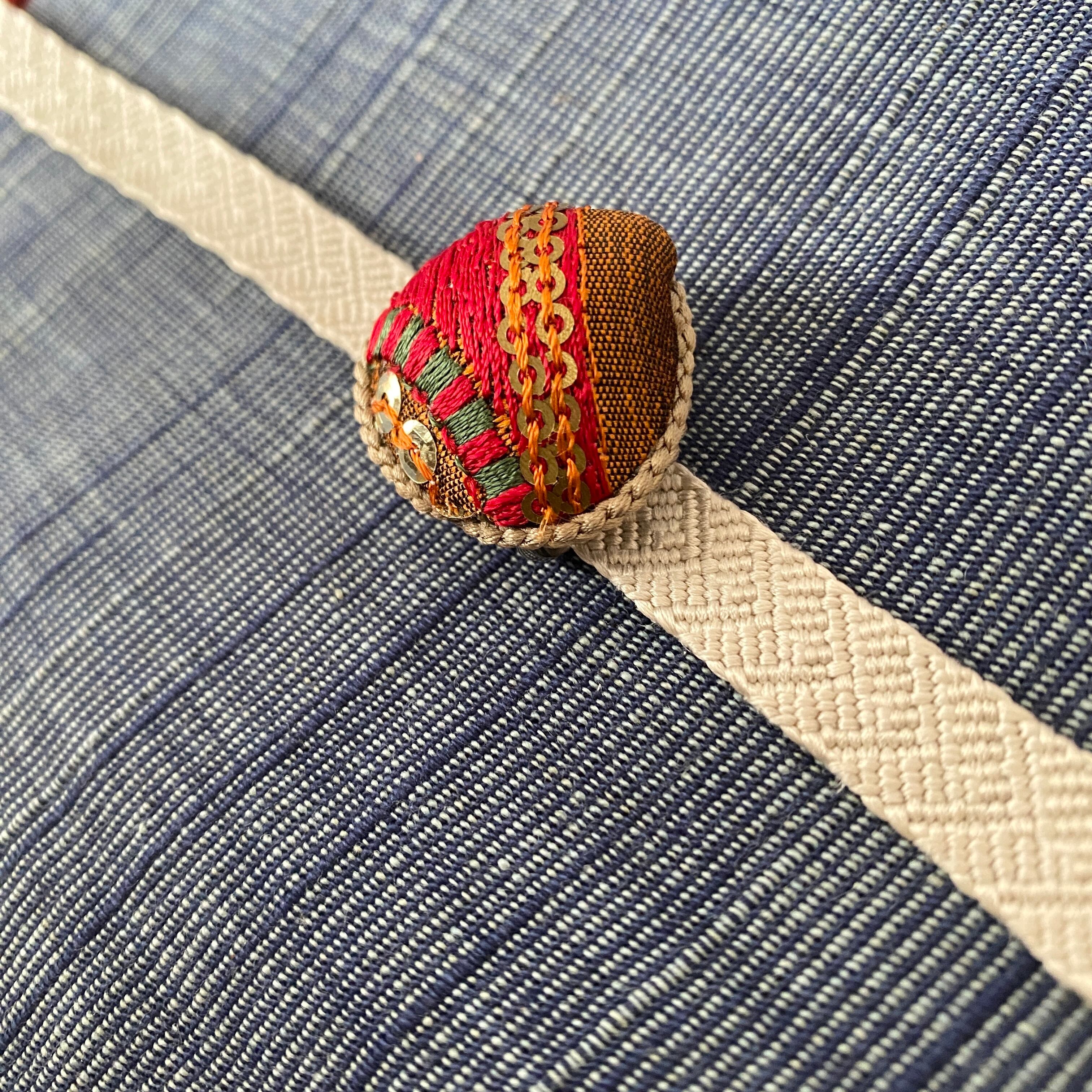 A rare, extra-large Shijimi clam shell wrapped in vibrantly embroidered ribbon from India.