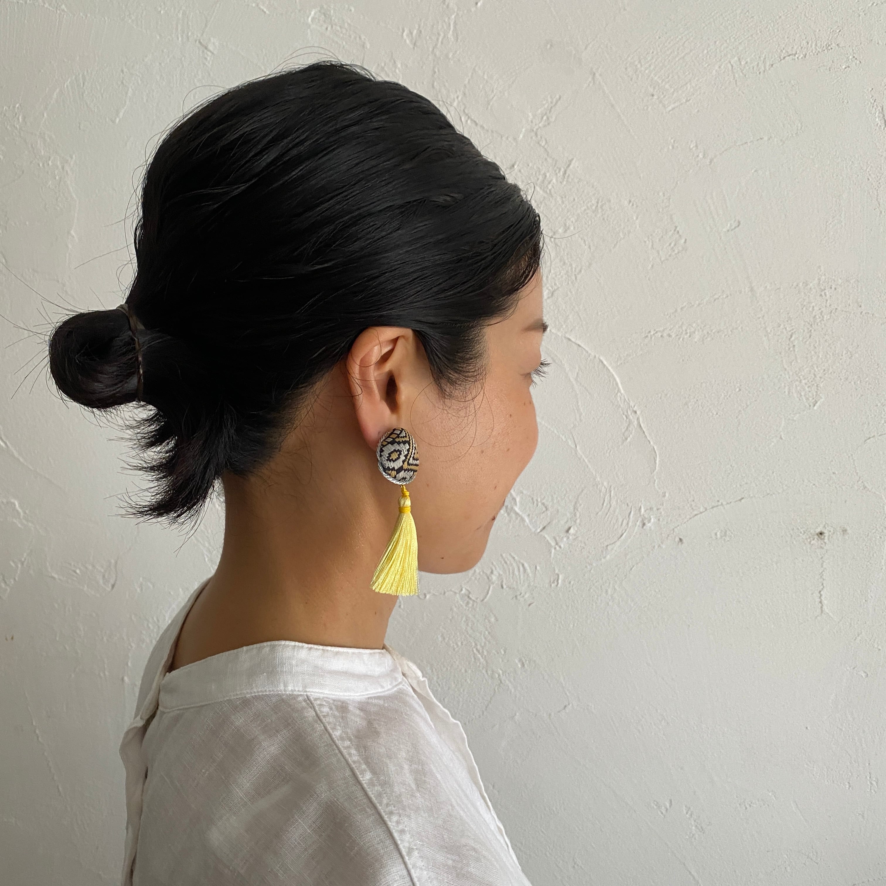 Tassel earrings made of clam shells from Lake Shinji wrapped in Asian ribbon.