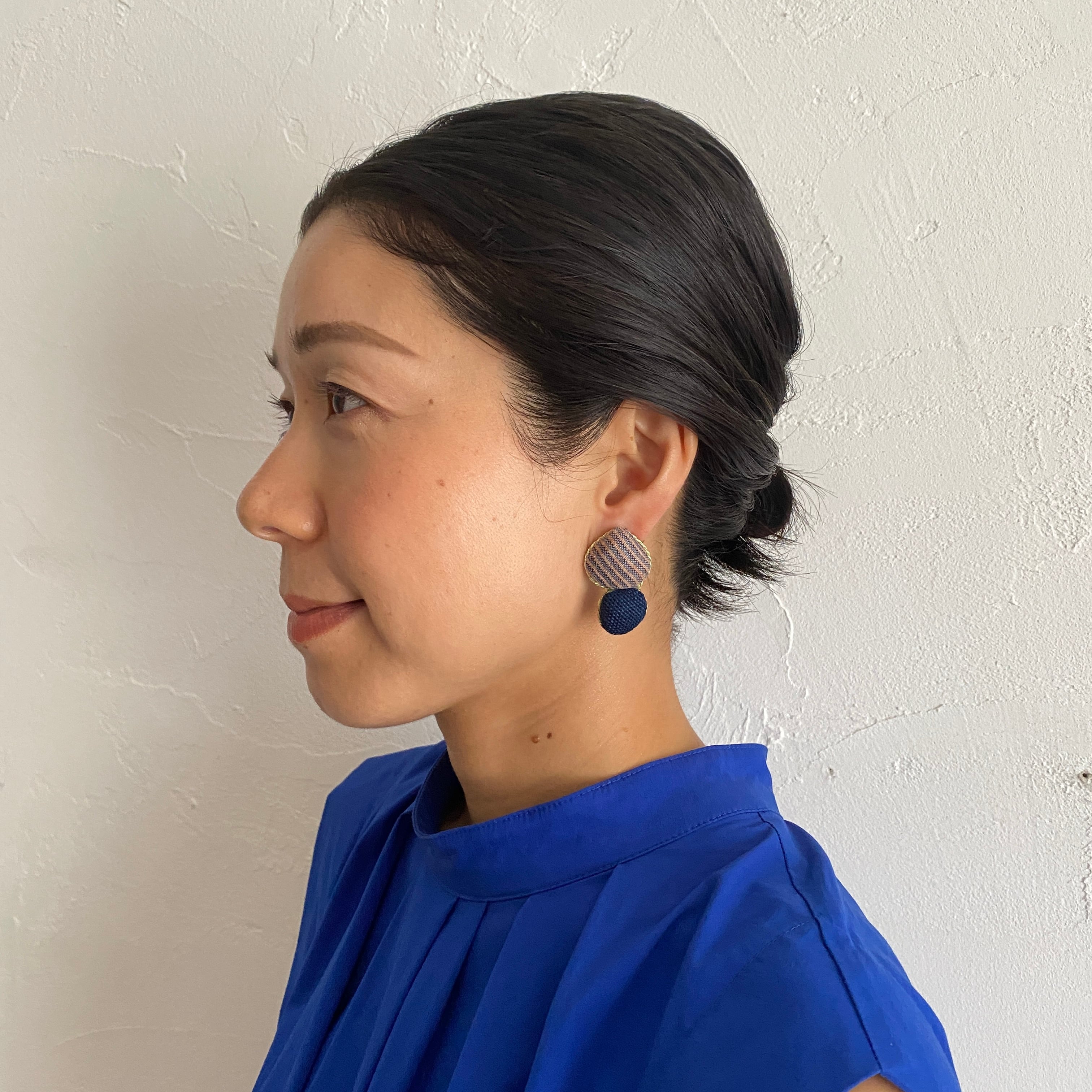 "宍道湖産しじみの貝殻を、結工房の手織り布で包んだイヤリング。
